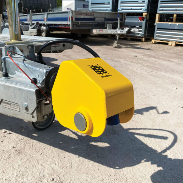 - The robust yellow steel casing with anti-saw features covers the fixing bolts of the hitch and immobilises the handle to prevent theft